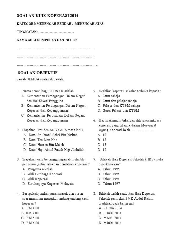 Soalan Kuiz Koperasi Dan Pengguna Pdf